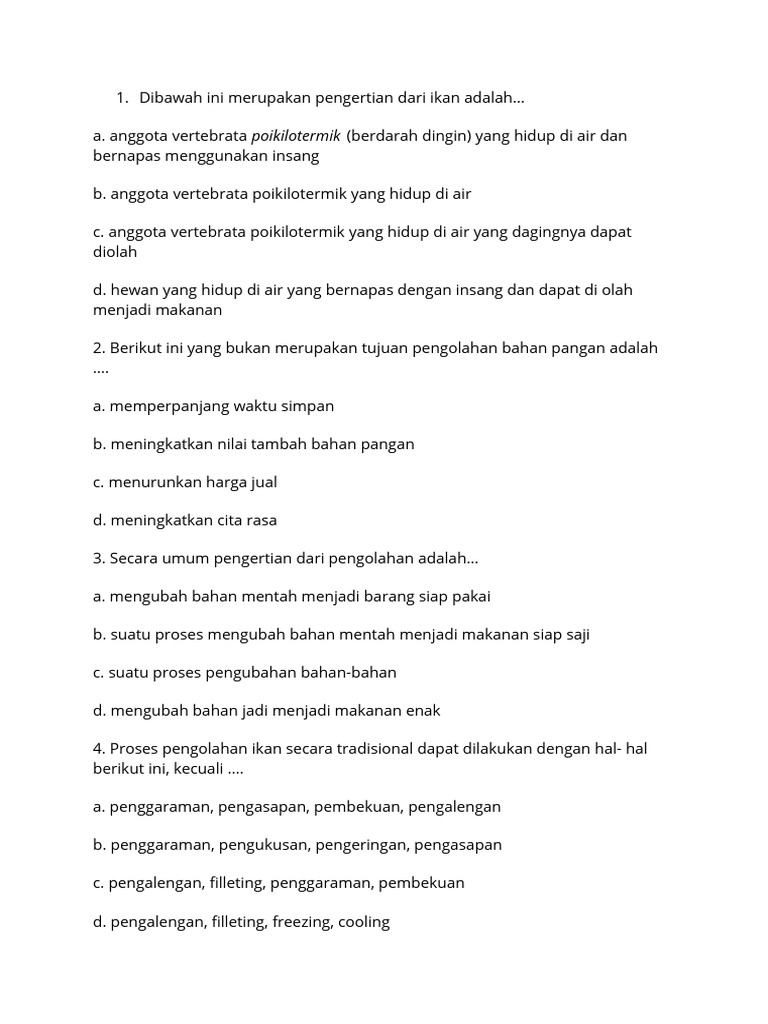 • Contoh: "Jelaskan tahapan-tahapan pengolahan ikan menjadi produk abon ikan, mulai dari pemilihan bahan baku hingga pengemasan. Sertakan pula aspek kebersihan dan keamanan pangan yang harus diperhatikan." (Extended Response).