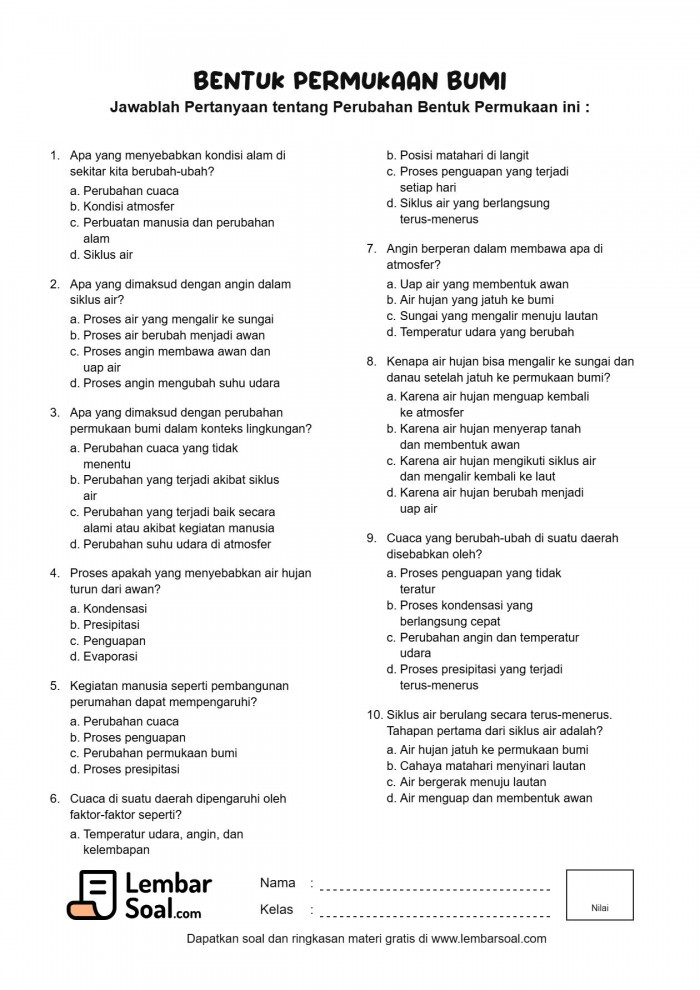 Memahami berbagai bentuk permukaan bumi adalah langkah awal yang penting bagi siswa kelas 3 SD untuk mengenal dunia di sekitar mereka. Dengan materi yang tepat, soal-soal yang relevan, dan metode pengajaran yang menarik, kita dapat membantu anak-anak untuk tidak hanya menghafal nama-nama bentang alam, tetapi juga memahami keunikan, keindahan, dan peran penting setiap bentuk permukaan bumi dalam ekosistem planet kita. Soal-soal IPA yang dirancang dengan baik menjadi jembatan krusial untuk mengukur pemahaman ini dan mendorong rasa ingin tahu mereka untuk terus belajar dan menjelajahi keajaiban bumi.